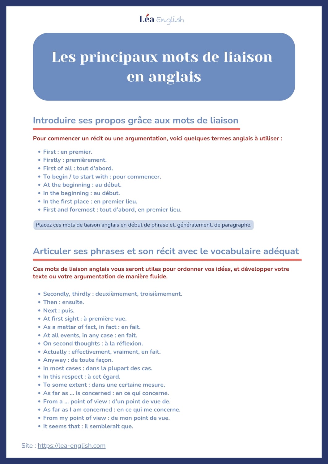 Téléchargez la fiche PDF "les principaux mots de liaison en anglais"