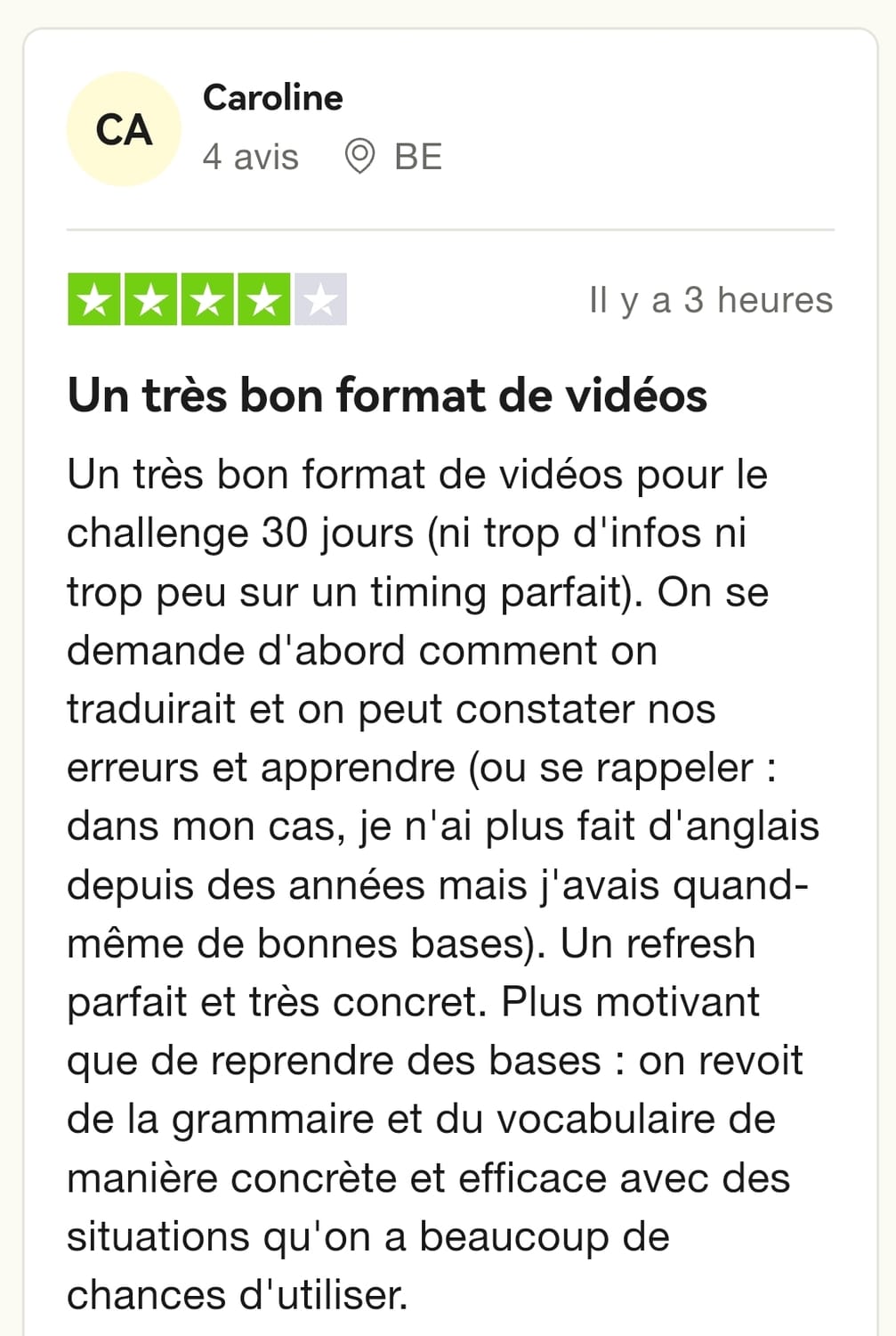 Cette formation est partie en 4 modules, vous pouvez en suivre 1 par semaine. Si vous suivez ce rythme, vous pourrez donc avoir acquis des bases solides en anglais et tenir une conversation en anglais d'ici 1 mois.