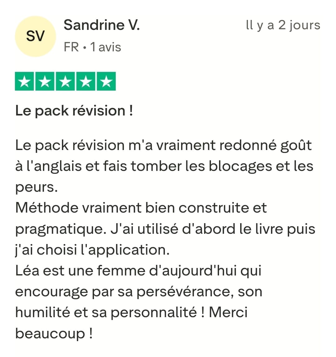 Ce produit bénéficie d'une garantie de 30 jours au cours de laquelle vous pouvez tester le Pack de révision. Si après 30 jours après votre commande, vous avez utilisé le Pack de révision activement mais que vous n'avez pas progressé, envoyez nous un mail à cette adresse hello@lea-english.com et nous vous rembourseront le montant que vous avez dépensé.