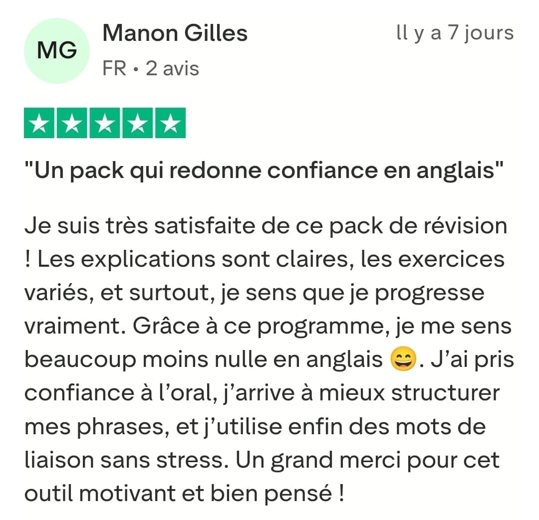 Le Pack contient TOUT ce qu'il faut réviser pour vous débrouiller en anglais, vous n'aurez pas besoin de compléter avec d'autres ressources.