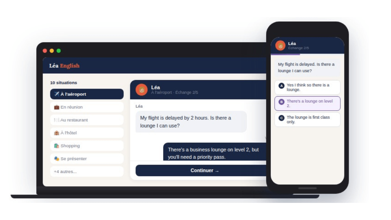 Pas besoin de parler à voix haute, pas de personne en face, pas d'intelligence artificielle. Vous lisez, vous réfléchissez, vous choisissez. Un feedback vous explique pourquoi c'est juste ou non.