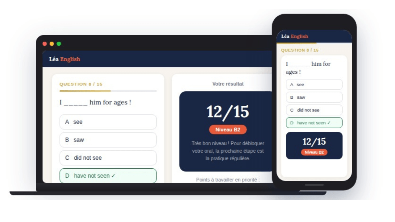 50 questions pour évaluer votre niveau A2 → C1 avec un résultat personnalisé et des recommandations concrètes sur ce que vous devez travailler en priorité.